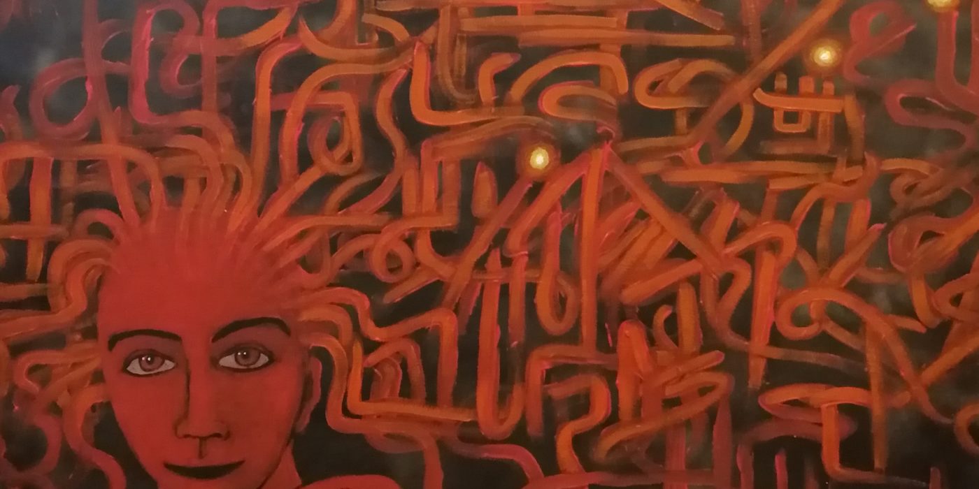 Teos on toteutettu 90 cm x 90 cm kankaalle akryyliväreillä. Joskus, kun keskityt oikein ajatuksiisi ja olet juuri saamassa jostakin ideasta kiinni, niin toinen ihminen tulee ja sekoittaa ajatuksesi. Teos kuvaa juuri tätä hetkeä.