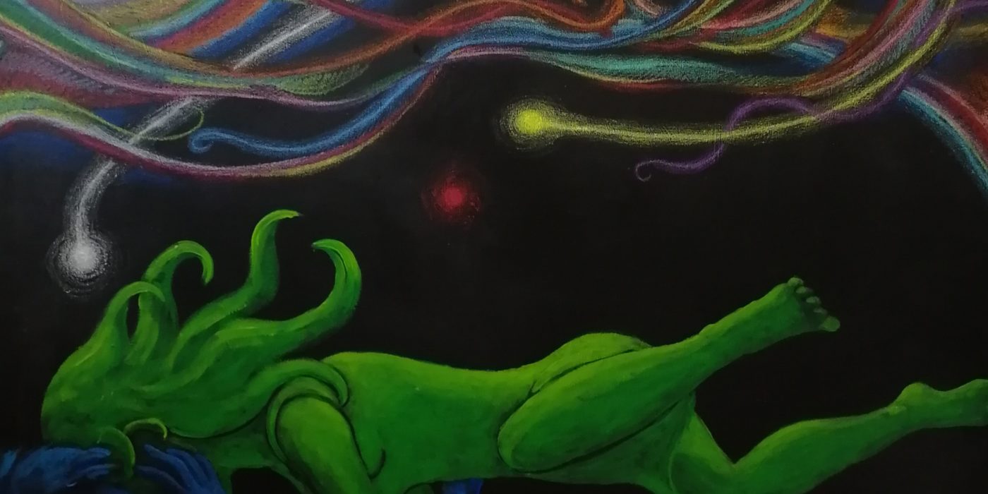 Teos on toteutettu 90 cm x 90 cm kankaalle akryyliväreillä ja vahaliiduilla. Meidän kaikkien ihmisten kohtalot voivat satunaisesti kietoutua toisiinsa kuin langat avaruudessa ja sitten taas irrota toisistaan. Kuka ohjailee noita lankoja?